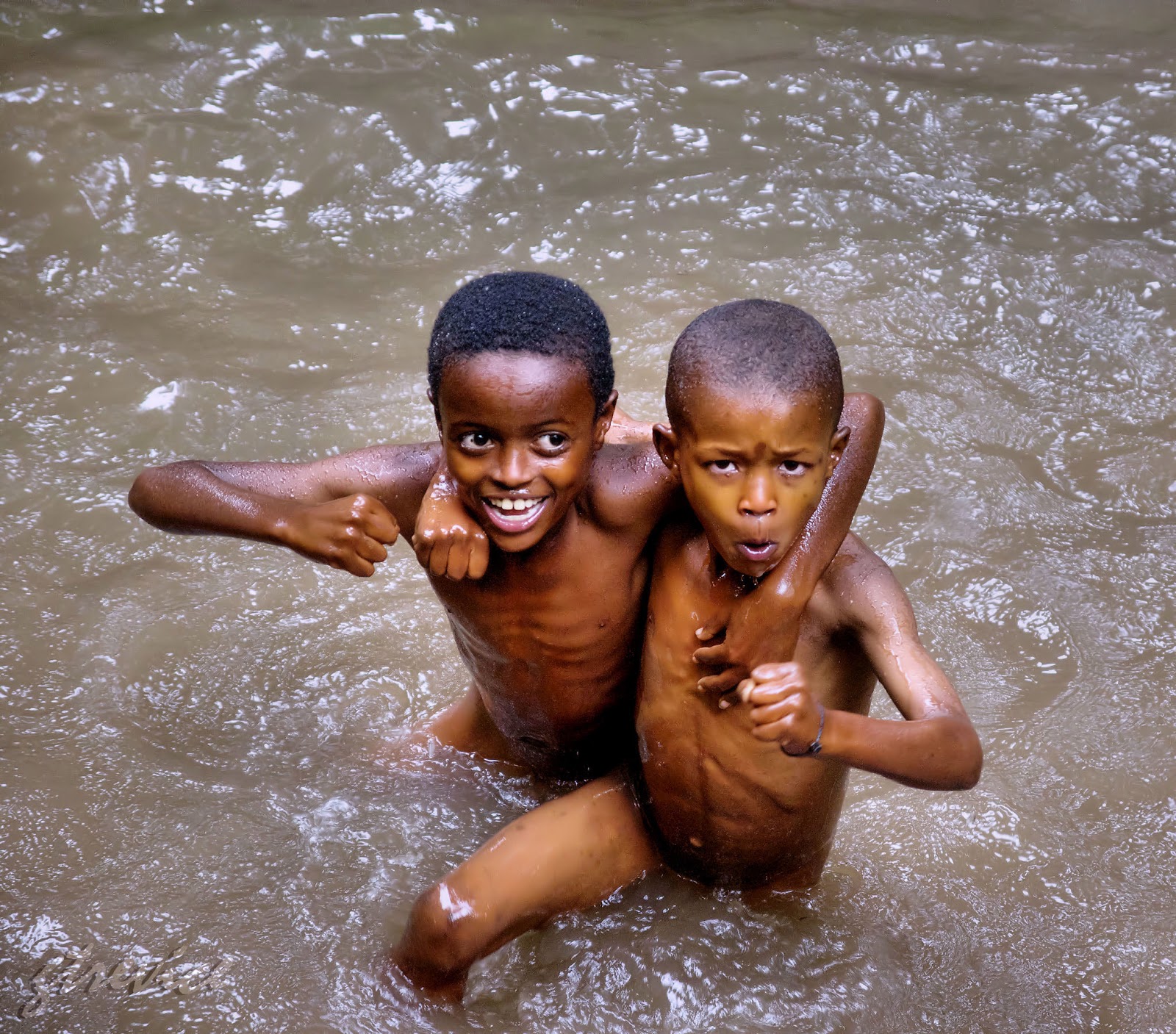 agua cristalina. Los niños se quitaron la ropa y empezaron a bañarse locos de