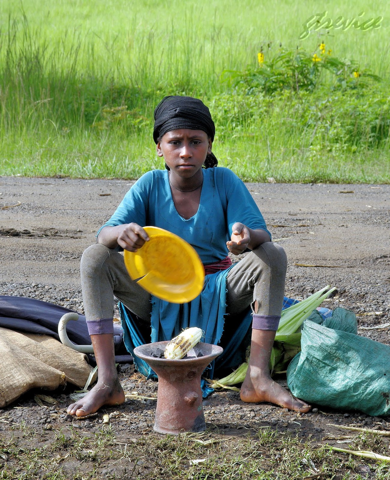 Parecía un lugar donde se vendiera esta. No sabía si era de trigo o maíz o Teff, pero era una estampa maravillosa. Sobre todo por la mujer que prensaba un saco de harina con un enorme cayado de madera. Era preciosa y me miró con cierto temor cuando decidí disparar sin pensarlo. Vestía una falda azul clarito y una camiseta azul cielo, aparte de un pañuelo blanco en la cabeza.